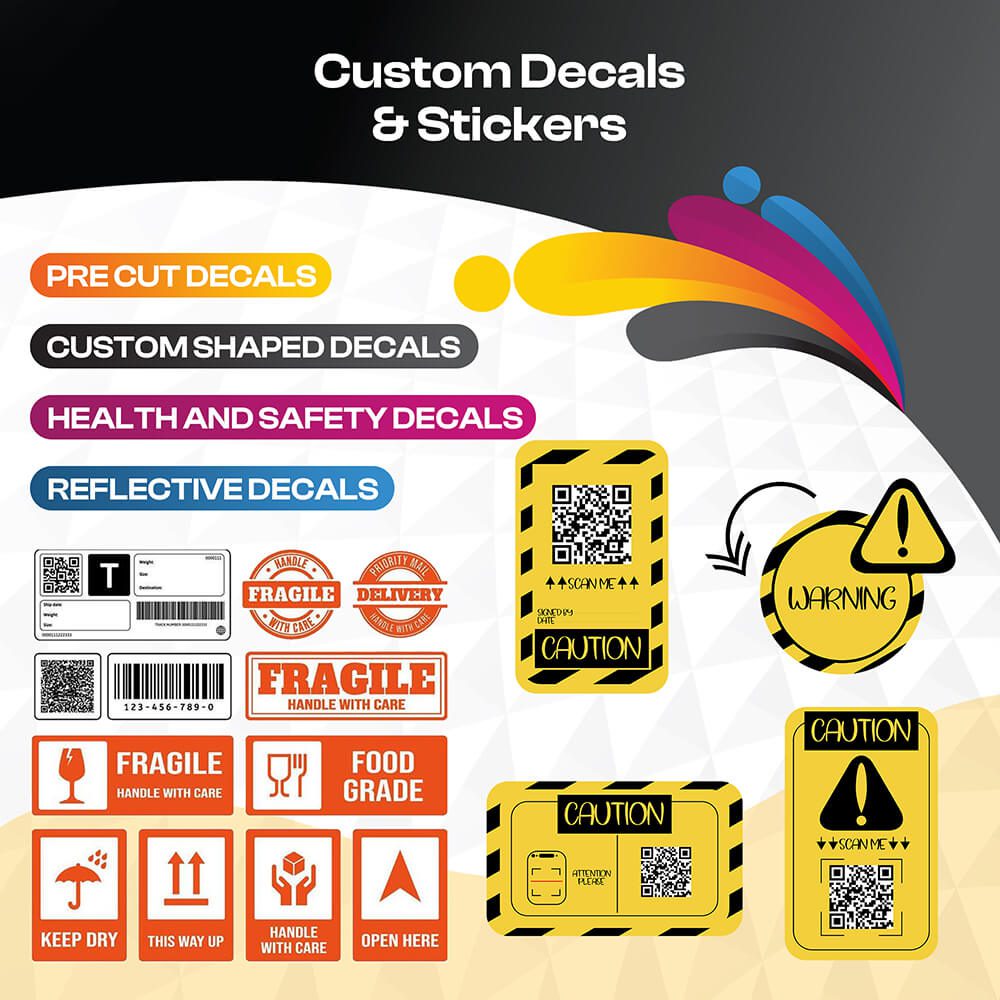 Promote your brand with our custom decals and stickers available in various sizes, shapes, and finishes for indoor and outdoor branding, promotions, and product labeling.