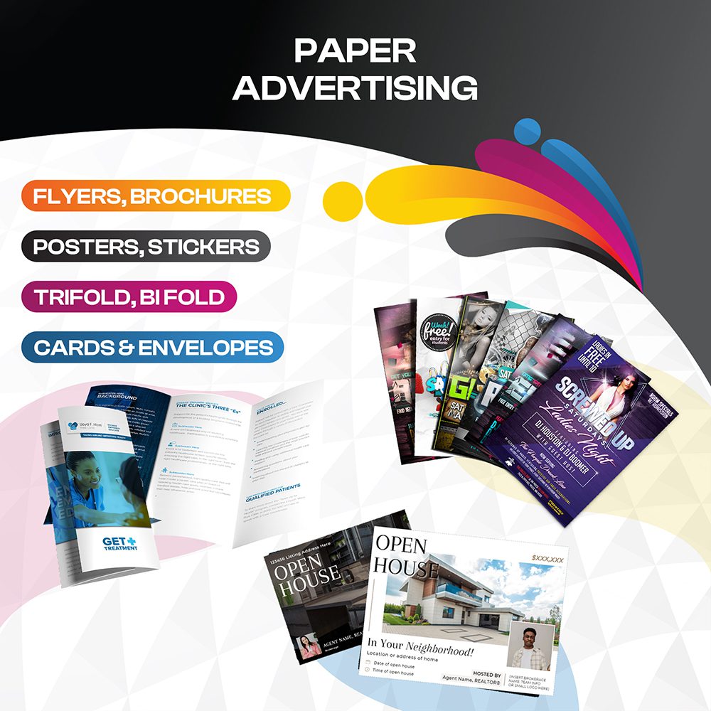 Fast Track Signs offers professional and high-quality paper advertising solutions, including flyers, brochures, posters, print ads, and more, to promote your brand and build trust.